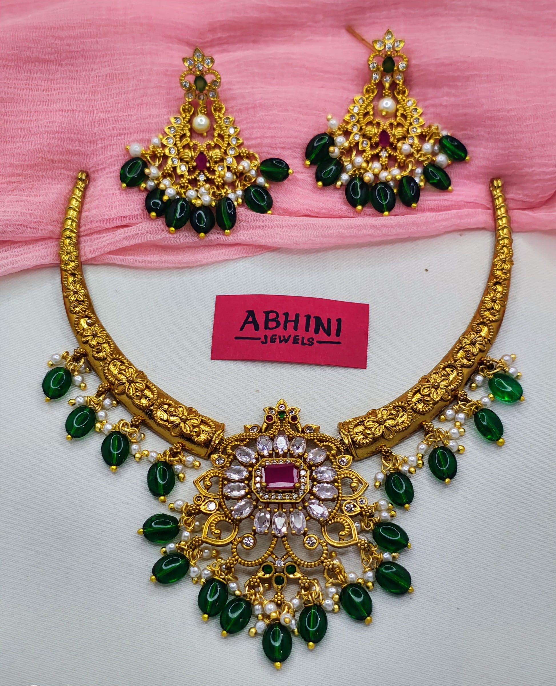 The Kanti Haar Necklace combines traditional elegance with contemporary style. Crafted in gold plating, this piece features lustrous green pearls and a graceful pendant that catches light beautifully. The rich green tones paired with warm gold create a striking contrast that complements various skin tones and outfits effortlessly.